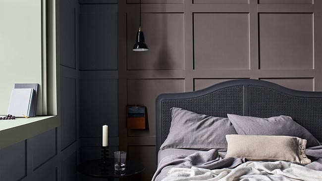 Sơn tường với màu xanh ô liu xa hoa, sắc thái phong phú của nó rất phù hợp cho phong cách tông xuyệt tông cho căn phòng. Bên cạnh đó, trần sẽ có cảm giác cao hơn bằng cách sơn màu hồng phấn sang trọng cho một phần ba trên cùng của bức tường.